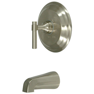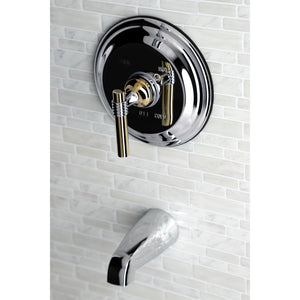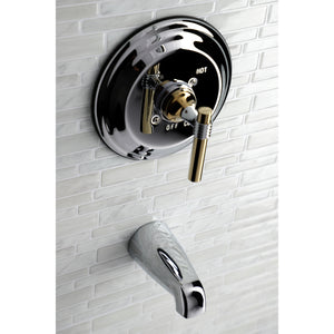 The sophisticated look and flawless design of this tub and shower faucet evokes glamorous appeal that's ideal for modern washrooms. Complete with an easy-to-turn lever handle, an optimum bathing experience awaits. Enjoy the sturdy brass construction and premium brushed nickel/polished brass finishes for a fixture that will last for years to come. A pressure balanced valve is included for safety and protection against accidental burns.