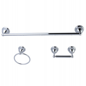 • 3 piece set includes: 24" towel bar, towel ring, and toilet paper holder