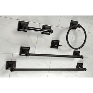 • Set includes 18-inch towel bar, 24-inch towel bar, towel ring, and toilet paper holder and robe hook