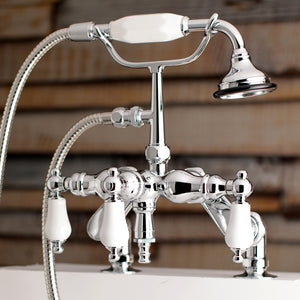 Vintage opulence finds itself within this deck-mount clawfoot tub faucet. As the perfect complement to your tub, this will complete your refined bathroom decorum with the help of its premium, glistening polished chrome finish and telephone style hand shower. The solid brass construction also makes for a heavy, quality made product.