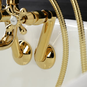 Wall mount clawfoot tub faucets are the perfect fixture to add decorative flair within your bathroom because of their unique architectural elements. With vintage opulence, this will complete your refined bathroom decorum with the help of its premium polished brass finish and traditionally styled handheld shower. The solid brass construction also makes for a heavy, quality made product. Hand shower with porcelain handle and 59-inch hose.