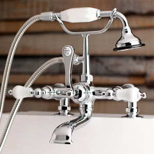 Vintage opulence finds itself within this deck-mount clawfoot tub faucet. As the perfect complement to your tub, this will complete your refined bathroom decorum with the help of its premium, glistening polished chrome finish and telephone style hand shower. The solid brass construction also makes for a heavy, quality made product.