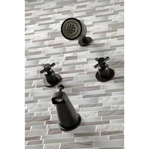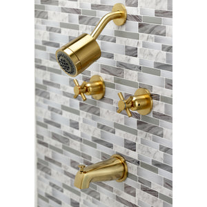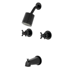 Dive into modern design with the sleek and cylindrical styling of this tub and shower faucet. Complete with easy-to-turn cross handles, an optimum bathing experience awaits. Enjoy the sturdy brass construction and premium antique brass finish for a fixture that will last for years to come. Internal valve hardware is included for your use.