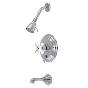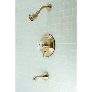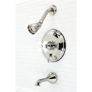 The traditional charm of this tub and shower faucet brings classical artistry to your home. Complete with an easy-to-turn cross handle, an optimum bathing experience awaits. Enjoy the sturdy brass construction and premium brushed nickel finish for a fixture that will last for years to come. A pressure balanced valve is included for safety and protection against accidental burns.