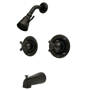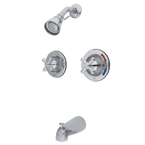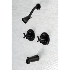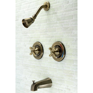 Return to the antique designs of the early 20th Century with this tub and shower faucet, offering detailings of refined splendor and ornate design to your home. Complete with easy-to-turn cross handles, an optimum bathing experience awaits. Enjoy the sturdy brass construction and premium brushed nickel finish for a fixture that will last for years to come. A pressure balanced valve is included for safety and protection against accidental burns.