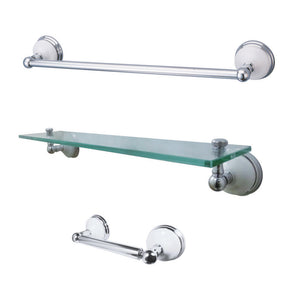 • 3 piece bathroom accessory kit includes: 18" towel bar, toilet paper holder, and glass self